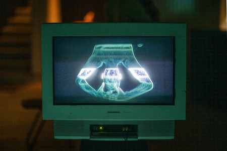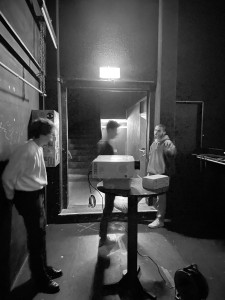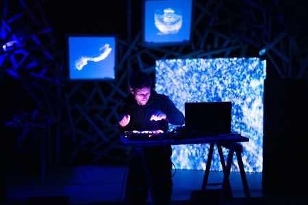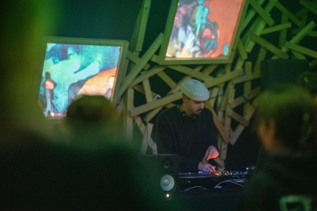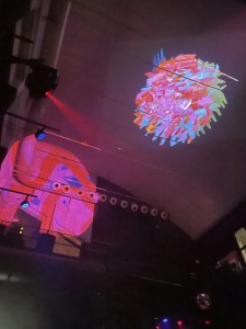 -> ConcertDerrière une barrière de télévisions cathodiques modulées par le collectif Goblin Vision, des DJs font face à quatre grandes toiles suspendues qui diffusent une représentation numérique des mouvements dans la salle.